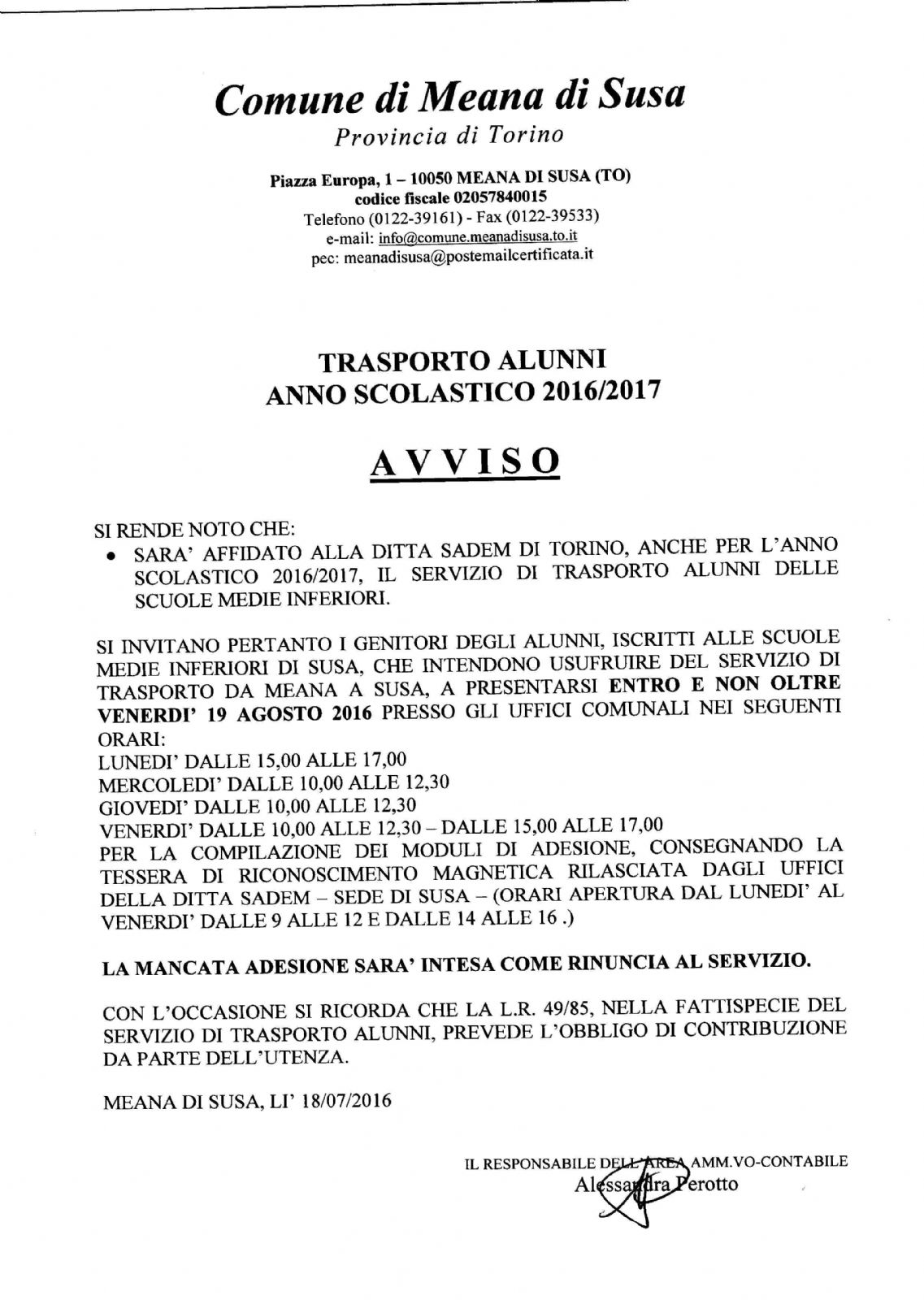 AVVISO TRASPORTO ALUNNI A.S. 2016-2017