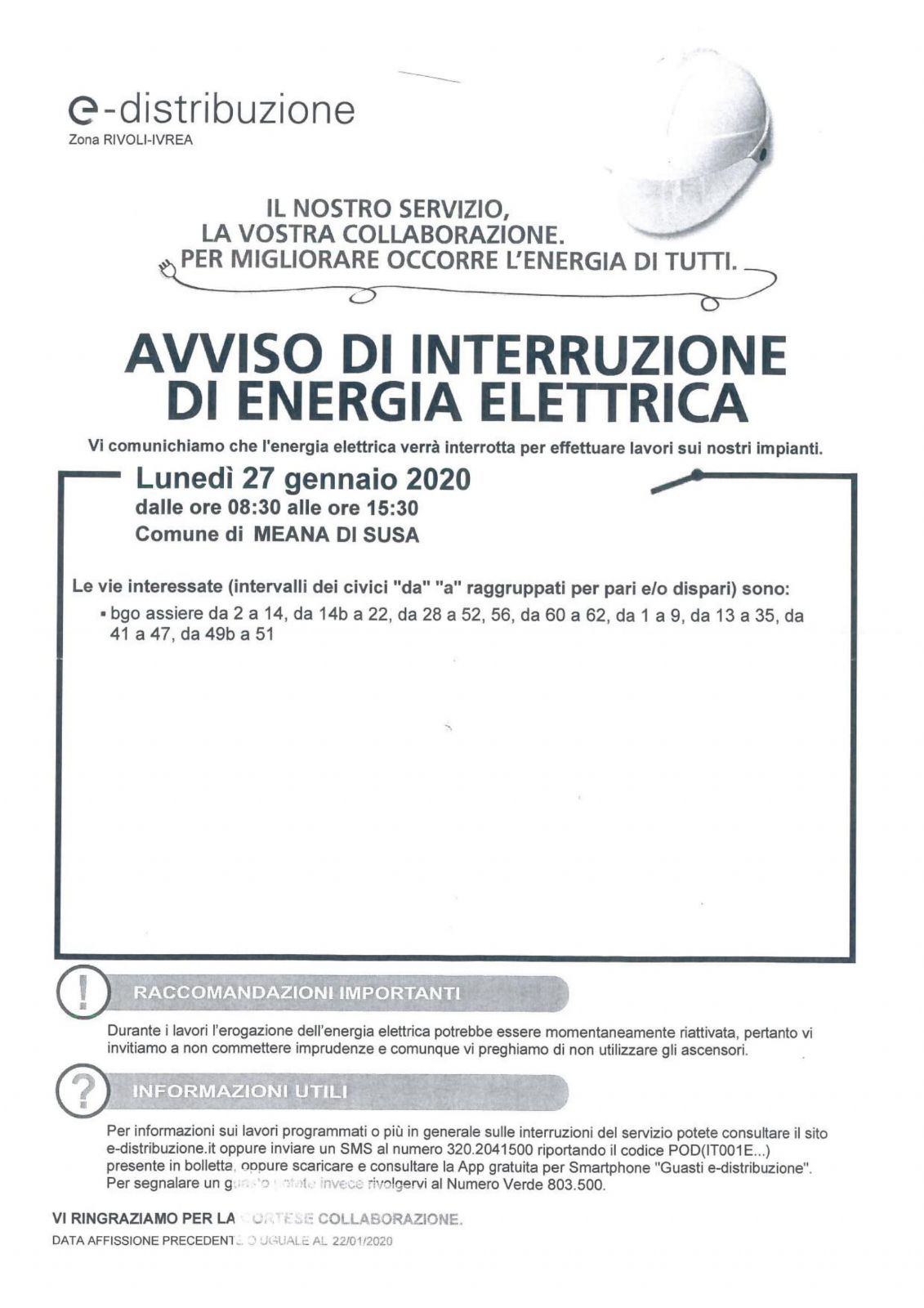 E-DISTRIBUZIONE AVVISA CHE LUNEDI' 27 GENNAIO 2020 DALLE ORE 8,30 ALLE ORE 15,30 NELLA BORGATA ASSIERE VERRA' INTERROTTA L'ENERGIA ELETTRICA COME DETTAGLIATO NELL'ALLEGATO AVVISO