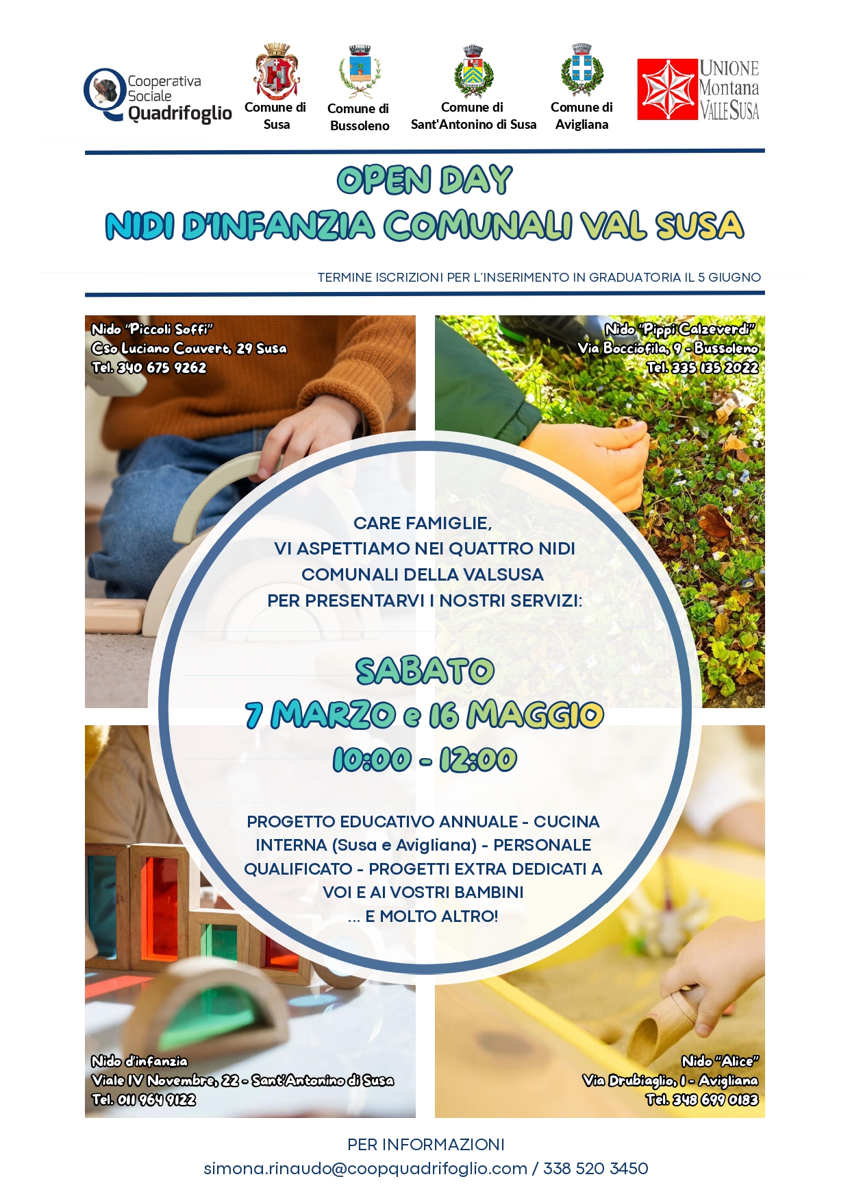 In allegato la locandina dell'Open Day con tutte le informazioni e gli altri nidi della Val Susa in cui si svolgeranno gli Open Day.